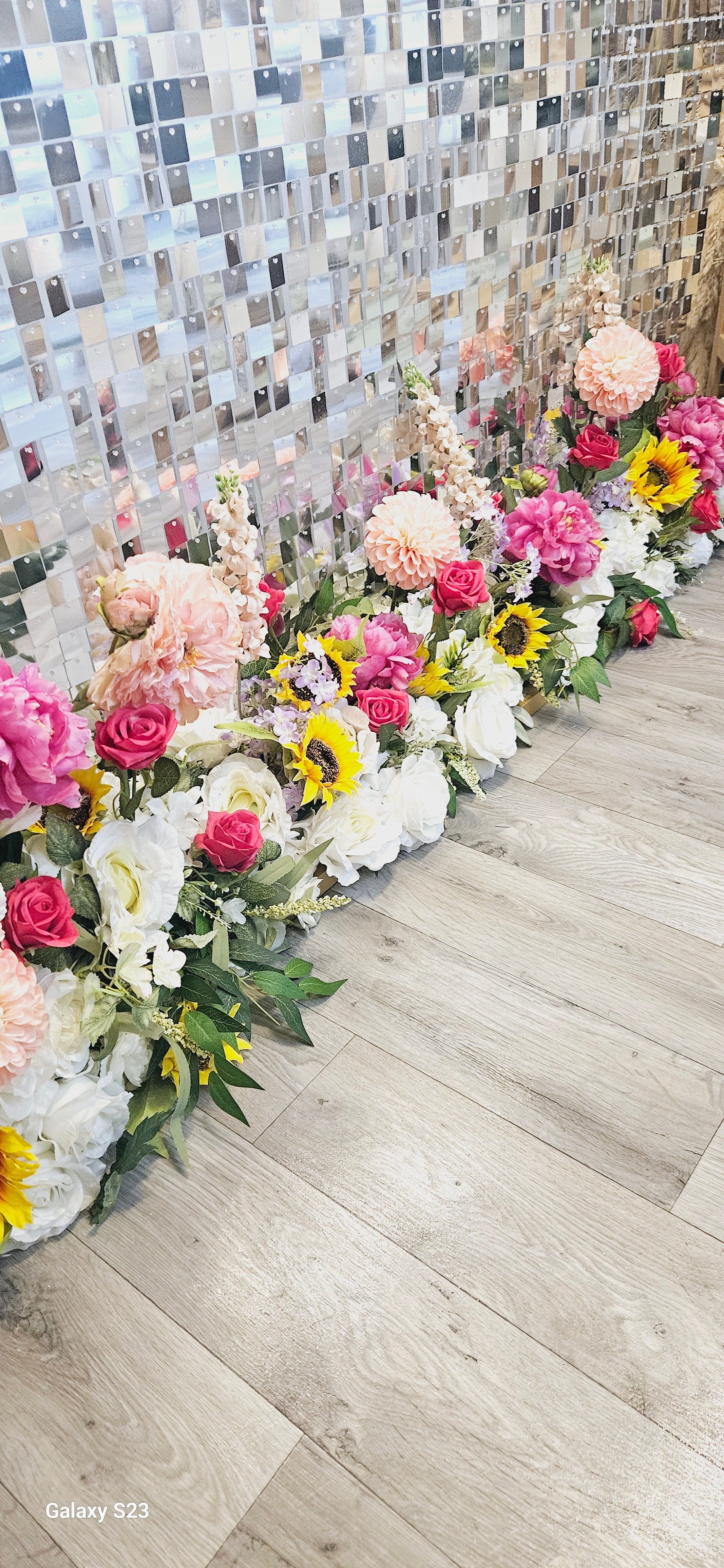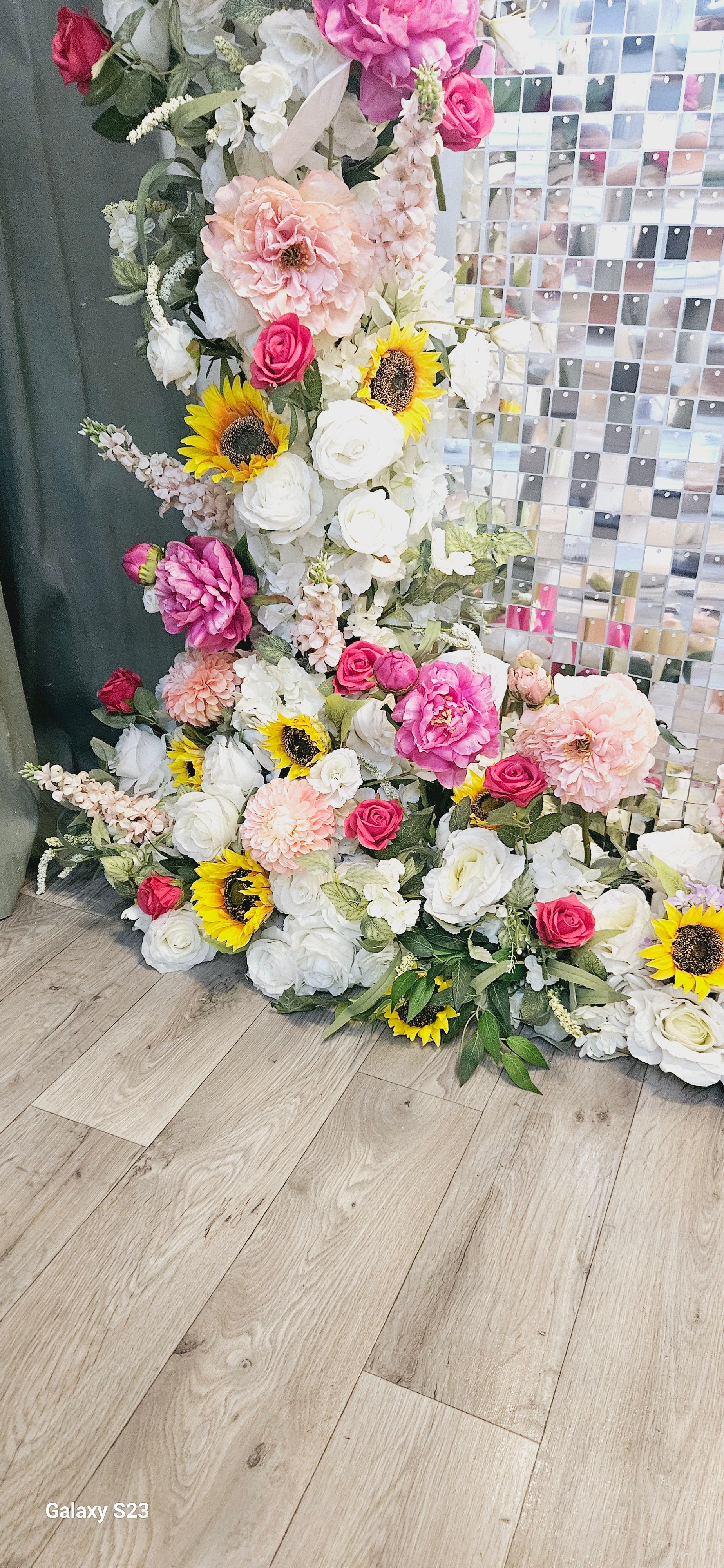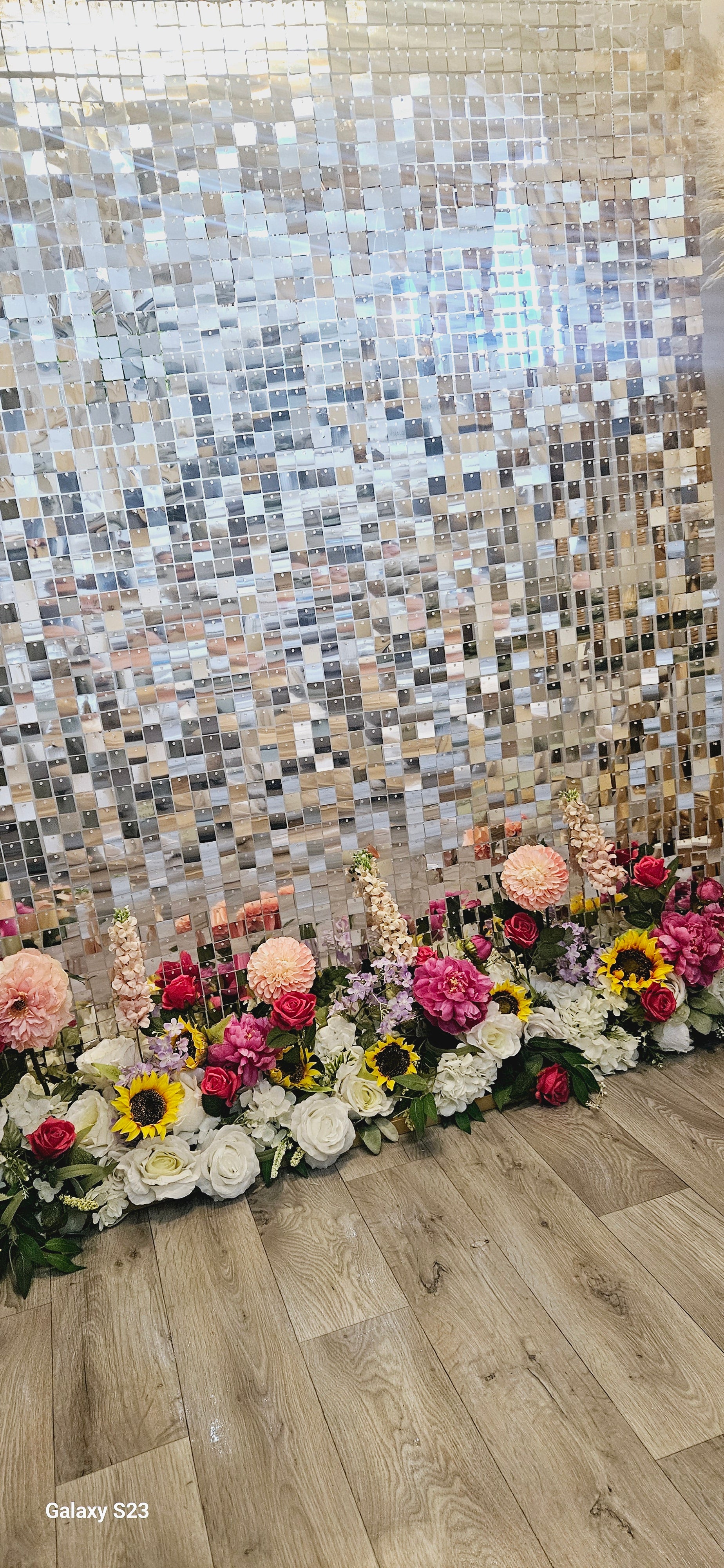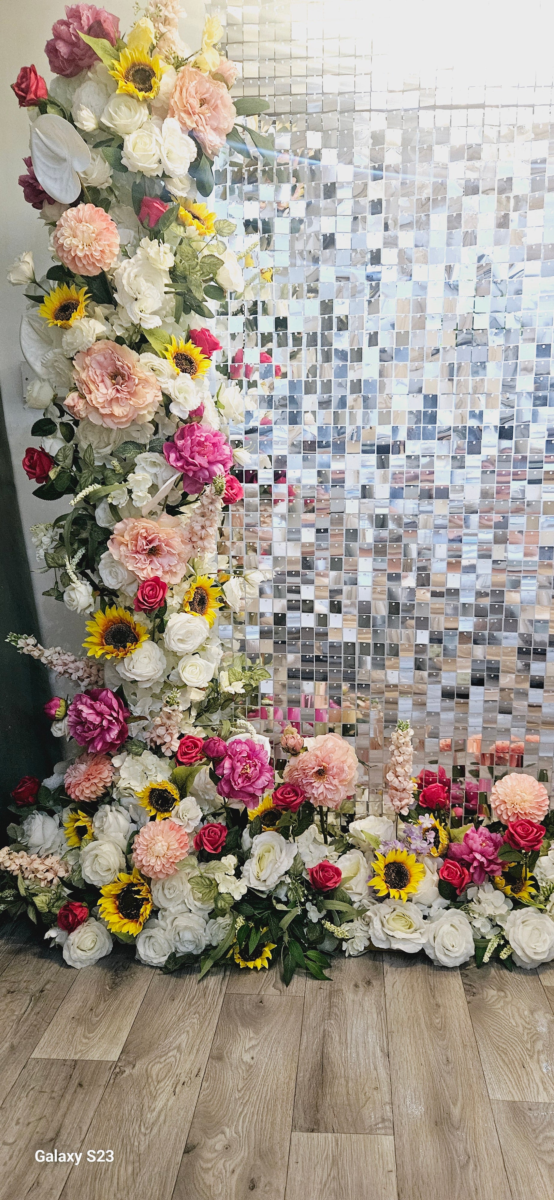 Not only is the silver wall enough on its own, we've taken it one step further and added our floral displays or a theme making this backdrop a show stopper